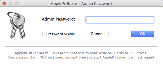 「ApplePi-Baker.app」をダブルクリックし,パスワード(使用しているパソコンのパスワード)を入力すると画面が開きます.