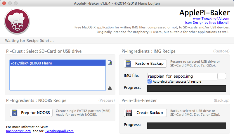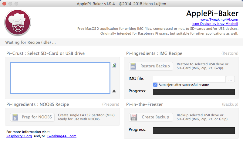 「Pi-Crust」の部分でコピー先のSDカードを選択します.また,「Pi-Ingredients」の部分でコピーしたいイメージファイルを選択します.