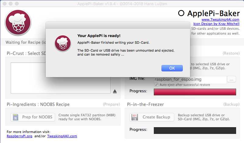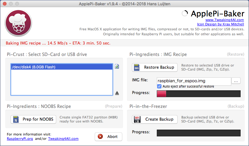 ここでは,Mac OSの場合に,無料の書き込みソフト「ApplePi-Baker」を使ってコピーする方法を説明します.Windowsの場合は,「Win32DiskImager」などのフリーソフトを使ってコピーできます.