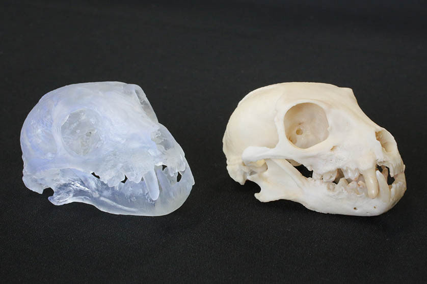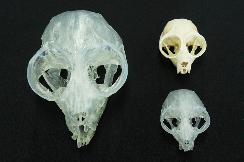 簡単に拡大・縮小したモデルを造形できます.写真はスローロリス頭骨・顎骨で,左:2倍体の造形物,右上:実物,右下:等倍の造形物,です.