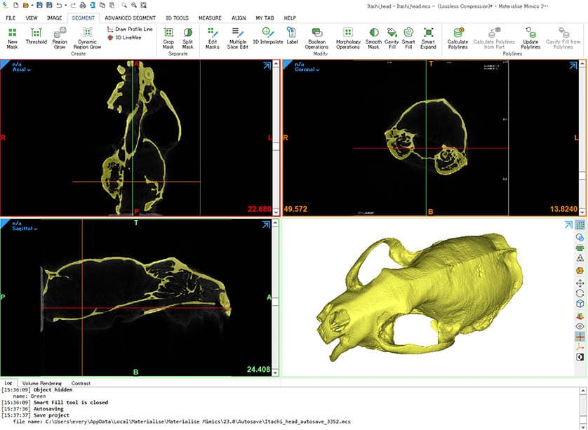 つぎに,Materialise社のソフトウェア「Mimics Innovation Suite」で画像の閾値処理を行って骨部分を抽出し,3Dモデルを作成しました.さらに,同社のソフトウェア「3-matic」へデータ転送し,エラー修正した後にSTLデータ化しました.