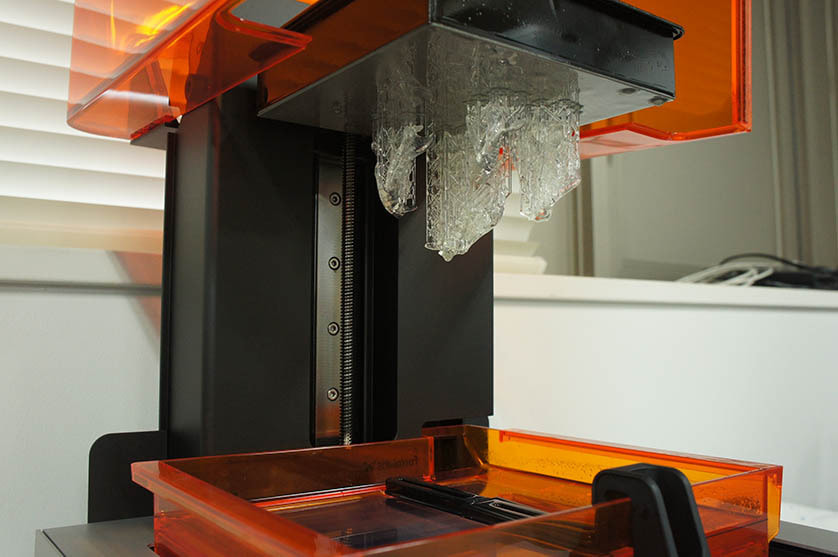 イソプロピルアルコールで余分な樹脂を洗浄し,乾燥させた後にサポート材を切除しました.造形物はたくさんのサポート材に支えられています.
