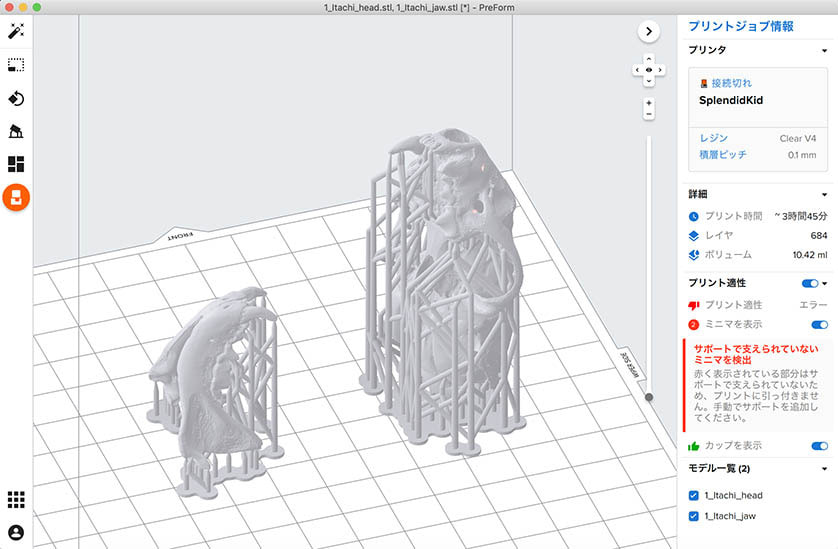 STLデータをFormlabs社のソフトウェアPreFormで開き,造形方向とレイアウトを決め,サポートを自動生成させました.同社の光造形3DプリンターForm2を使って,積層厚さ100 µmで造形しました.造形時間は4〜6時間でした.